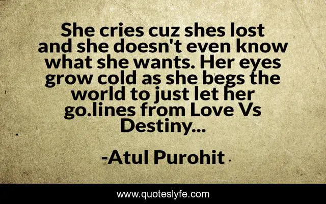 This page presents the quote "She cries cuz shes lost and she doesn't even know what she wants. Her eyes grow cold as she begs the world to just let her go.lines from Love Vs Destiny...". Author of this quote is Atul Purohit. This quote is about faith, life, novel, love, destiny, fiction, affection,.