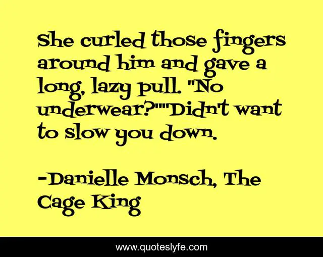 This page presents the quote "She curled those fingers around him and gave a long, lazy pull. "No underwear?""Didn't want to slow you down.". Author of this quote is Danielle Monsch, The Cage King. .