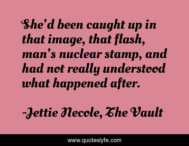 This page presents the quote "She’d been caught up in that image, that flash, man’s nuclear stamp, and had not really understood what happened after.". Author of this quote is Jettie Necole, The Vault. This quote is about apocalypse, new-adult-dystopian-romance,.
