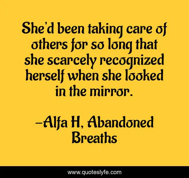 This page presents the quote "She'd been taking care of others for so long that she scarcely recognized herself when she looked in the mirror.". Author of this quote is Alfa H, Abandoned Breaths. This quote is about life, woman, love, compassion, poetry, taking-care-of-others, affection,.