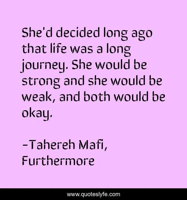 This page presents the quote "She'd decided long ago that life was a long journey. She would be strong and she would be weak, and both would be okay.". Author of this quote is Tahereh Mafi, Furthermore. .