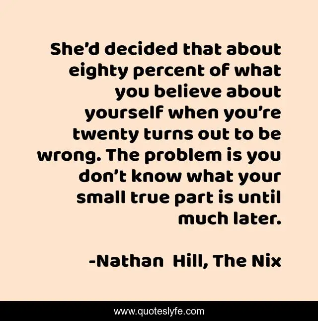 This page presents the quote "She’d decided that about eighty percent of what you believe about yourself when you’re twenty turns out to be wrong. The problem is you don’t know what your small true part is until much later.". Author of this quote is Nathan Hill, The Nix. This quote is about believe, true,.