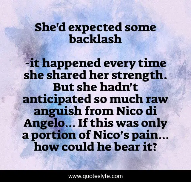 "it happened every time she shared her strength. But she hadn't anticipated so much raw anguish from Nico di Angelo… If this was only a portion of Nico’s pain… how could he bear it? Quotes." Quoteslyfe.com, 2025. Sat. 06 Dec. 2025. <https://www.quoteslyfe.com/quote/She-d-expected-some-backlash-75584>.