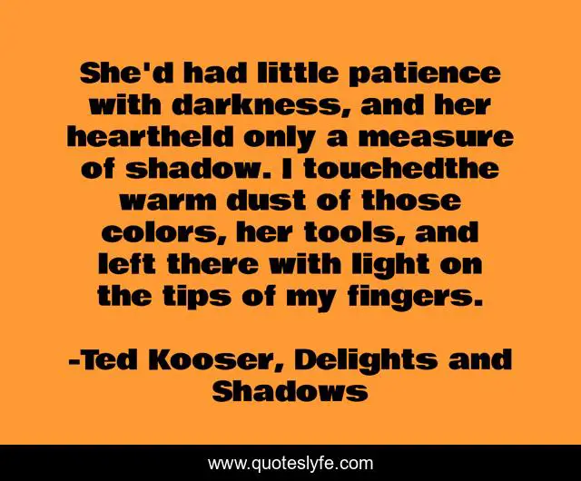 This page presents the quote "She'd had little patience with darkness, and her heartheld only a measure of shadow. I touchedthe warm dust of those colors, her tools, and left there with light on the tips of my fingers.". Author of this quote is Ted Kooser, Delights and Shadows. This quote is about touch, darkness,.