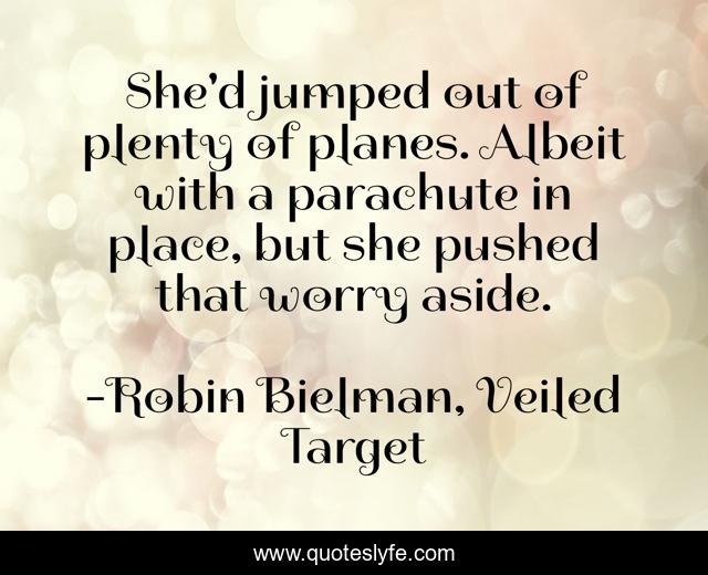 This page presents the quote "She'd jumped out of plenty of planes. Albeit with a parachute in place, but she pushed that worry aside.". Author of this quote is Robin Bielman, Veiled Target. This quote is about paranormal-romance, wolfen,.
