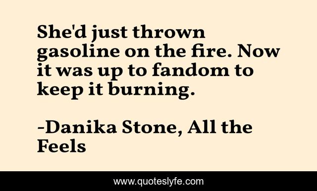 This page presents the quote "She'd just thrown gasoline on the fire. Now it was up to fandom to keep it burning.". Author of this quote is Danika Stone, All the Feels. This quote is about crowsourcing, passion, fanfic, fandom,.
