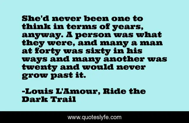 This page presents the quote "She'd never been one to think in terms of years, anyway. A person was what they were, and many a man at forty was sixty in his ways and many another was twenty and would never grow past it.". Author of this quote is Louis L'Amour, Ride the Dark Trail. .
