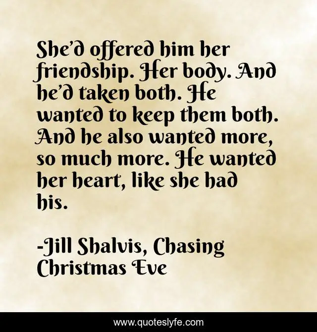 This page presents the quote "She’d offered him her friendship. Her body. And he’d taken both. He wanted to keep them both. And he also wanted more, so much more. He wanted her heart, like she had his.". Author of this quote is Jill Shalvis, Chasing Christmas Eve. .