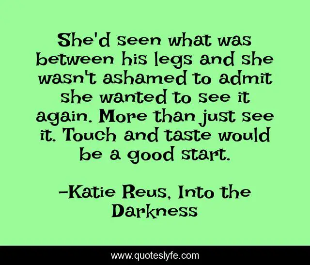 This page presents the quote "She'd seen what was between his legs and she wasn't ashamed to admit she wanted to see it again. More than just see it. Touch and taste would be a good start.". Author of this quote is Katie Reus, Into the Darkness. This quote is about shifters, paranormal-romance, demons, dragons,.