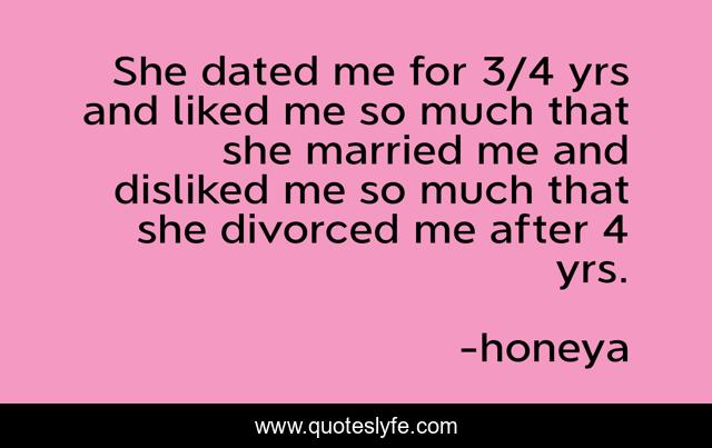 This page presents the quote "She dated me for 3/4 yrs and liked me so much that she married me and disliked me so much that she divorced me after 4 yrs.". Author of this quote is honeya. This quote is about infatuated, divorce, seperation, crush, marriage, infatuation, relation, craze, women,.
