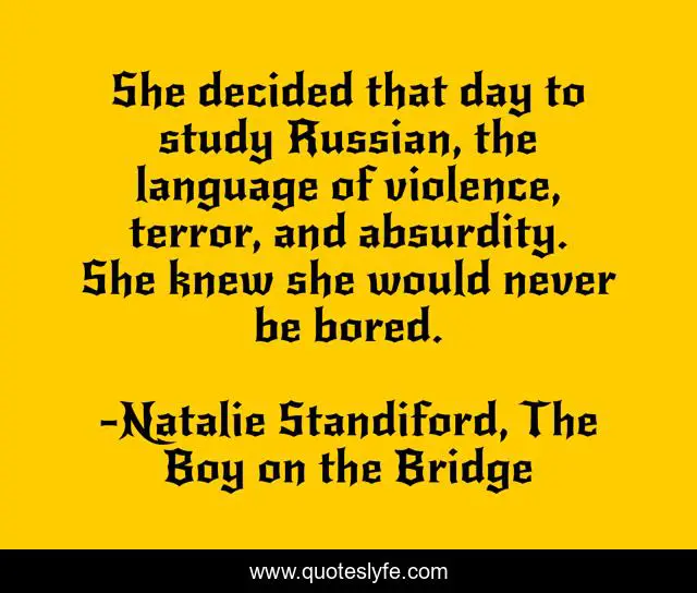 This page presents the quote "She decided that day to study Russian, the language of violence, terror, and absurdity. She knew she would never be bored.". Author of this quote is Natalie Standiford, The Boy on the Bridge. This quote is about slavic-peoples, language-learning, violence, russian-language, russian, terror, absurdity, russia,.