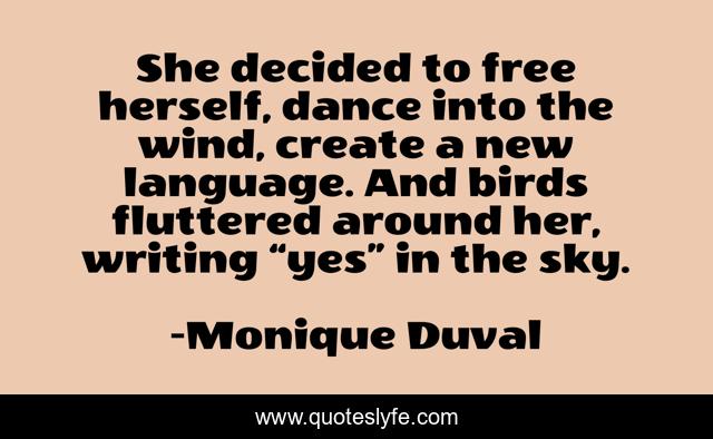 This page presents the quote "She decided to free herself, dance into the wind, create a new language. And birds fluttered around her, writing “yes” in the sky.". Author of this quote is Monique Duval. This quote is about dance, freedom, free, monique-duval, birds, wind,.