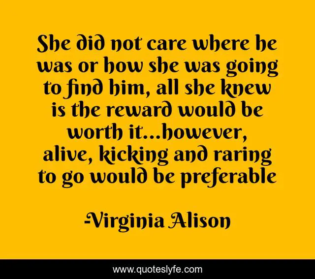 This page presents the quote "She did not care where he was or how she was going to find him, all she knew is the reward would be worth it...however, alive, kicking and raring to go would be preferable". Author of this quote is Virginia Alison. This quote is about cowgirl, lust, love, affection, cowboy,.