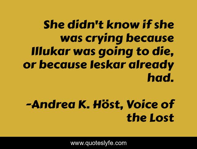 This page presents the quote "She didn't know if she was crying because Illukar was going to die, or because Ieskar already had.". Author of this quote is Andrea K. Höst, Voice of the Lost. This quote is about grief, loss, regret,.