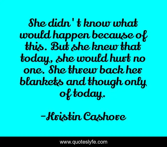 This page presents the quote "She didn't know what would happen because of this. But she knew that today, she would hurt no one. She threw back her blankets and though only of today.". Author of this quote is Kristin Cashore. This quote is about katsa, graceling, courage, independence, step-by-step, today,.