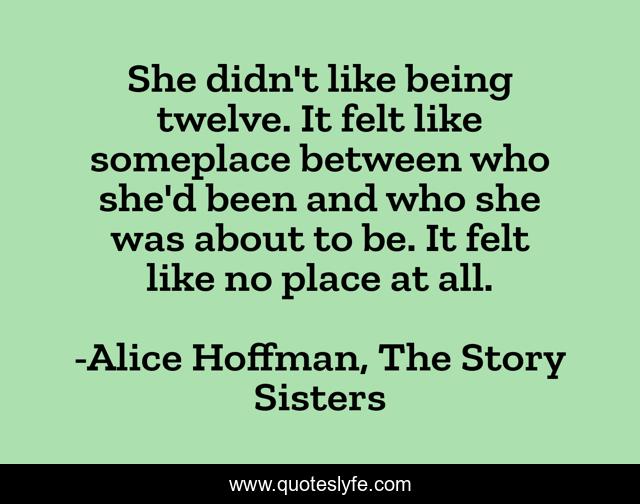This page presents the quote "She didn't like being twelve. It felt like someplace between who she'd been and who she was about to be. It felt like no place at all.". Author of this quote is Alice Hoffman, The Story Sisters. This quote is about children, growing-up,.