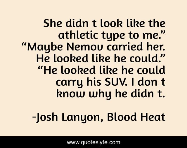 This page presents the quote "She didn‟t look like the athletic type to me.” “Maybe Nemov carried her. He looked like he could.” “He looked like he could carry his SUV. I don‟t know why he didn‟t.". Author of this quote is Josh Lanyon, Blood Heat. This quote is about witty, funny, taylor, comedy,.