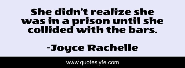 This page presents the quote "She didn't realize she was in a prison until she collided with the bars.". Author of this quote is Joyce Rachelle. This quote is about limitations, mental-limits, imprisoned, limits, mental-limitations, introvert, prison, psychology,.