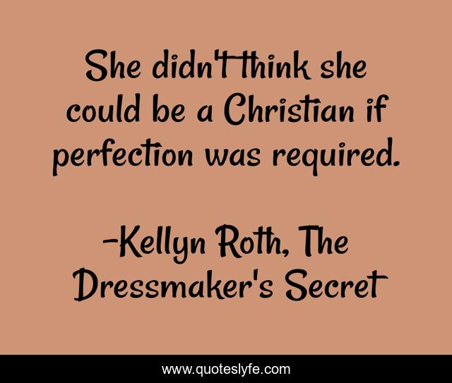 This page presents the quote "She didn't think she could be a Christian if perfection was required.". Author of this quote is Kellyn Roth, The Dressmaker's Secret. This quote is about christianity, christian, perfection, historical, alice,.