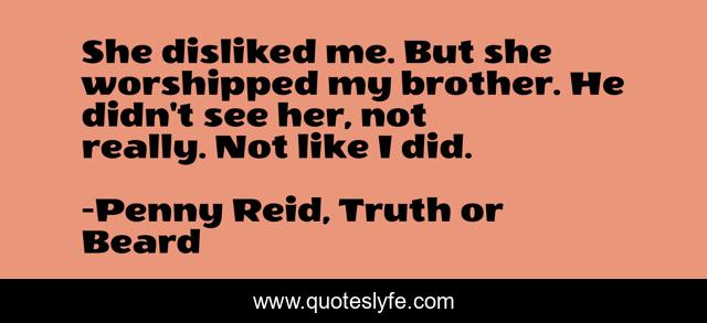 This page presents the quote "She disliked me. But she worshipped my brother. He didn't see her, not really. Not like I did.". Author of this quote is Penny Reid, Truth or Beard. This quote is about romance, love, passion, affection,.