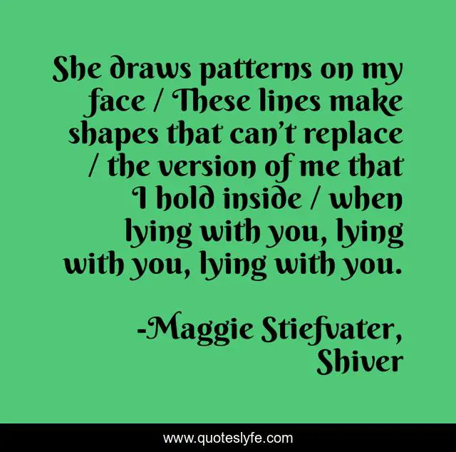 This page presents the quote "She draws patterns on my face / These lines make shapes that can’t replace / the version of me that I hold inside / when lying with you, lying with you, lying with you.". Author of this quote is Maggie Stiefvater, Shiver. .