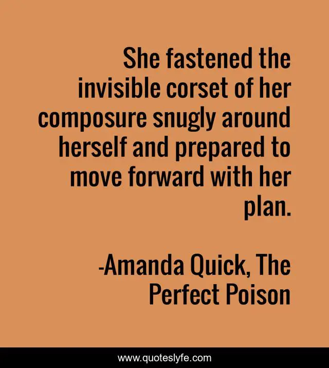 This page presents the quote "She fastened the invisible corset of her composure snugly around herself and prepared to move forward with her plan.". Author of this quote is Amanda Quick, The Perfect Poison. .