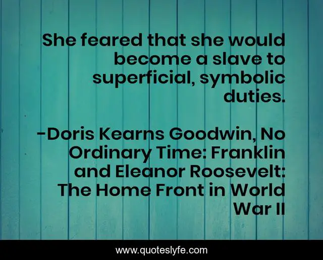 This page presents the quote "She feared that she would become a slave to superficial, symbolic duties.". Author of this quote is Doris Kearns Goodwin, No Ordinary Time: Franklin and Eleanor Roosevelt: The Home Front in World War II. This quote is about culture, distraction, ritual, priorities, materialism,.