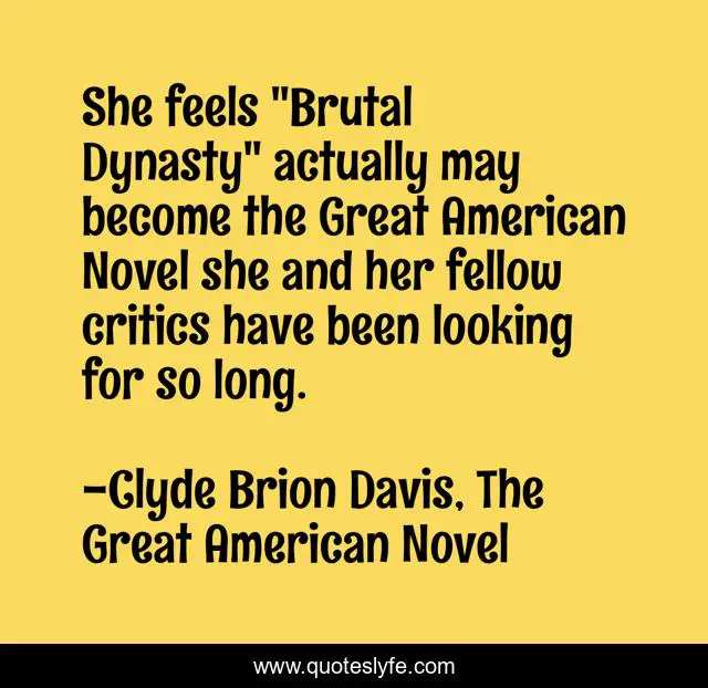 This page presents the quote "She feels "Brutal Dynasty" actually may become the Great American Novel she and her fellow critics have been looking for so long.". Author of this quote is Clyde Brion Davis, The Great American Novel. This quote is about gan, irony, dynasty,.