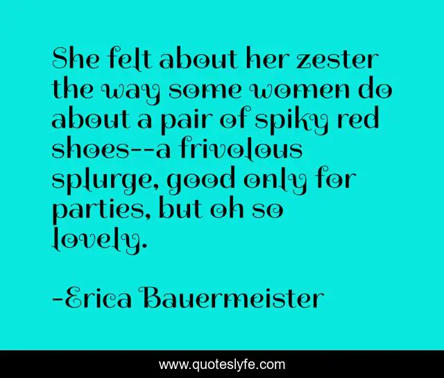 This page presents the quote "She felt about her zester the way some women do about a pair of spiky red shoes--a frivolous splurge, good only for parties, but oh so lovely.". Author of this quote is Erica Bauermeister. .