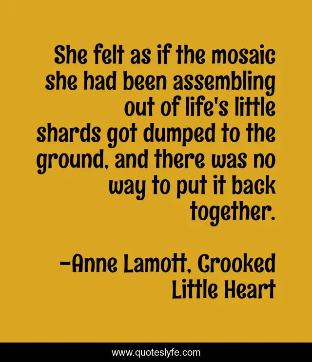 This page presents the quote "She felt as if the mosaic she had been assembling out of life's little shards got dumped to the ground, and there was no way to put it back together.". Author of this quote is Anne Lamott, Crooked Little Heart. This quote is about broken, shards, mosaic, shattered,.