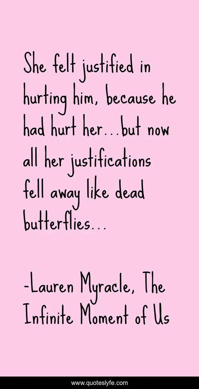This page presents the quote "She felt justified in hurting him, because he had hurt her...but now all her justifications fell away like dead butterflies...". Author of this quote is Lauren Myracle, The Infinite Moment of Us. This quote is about hurting, dead-butterflies, the-infinite-moment-of-us, hurt,.