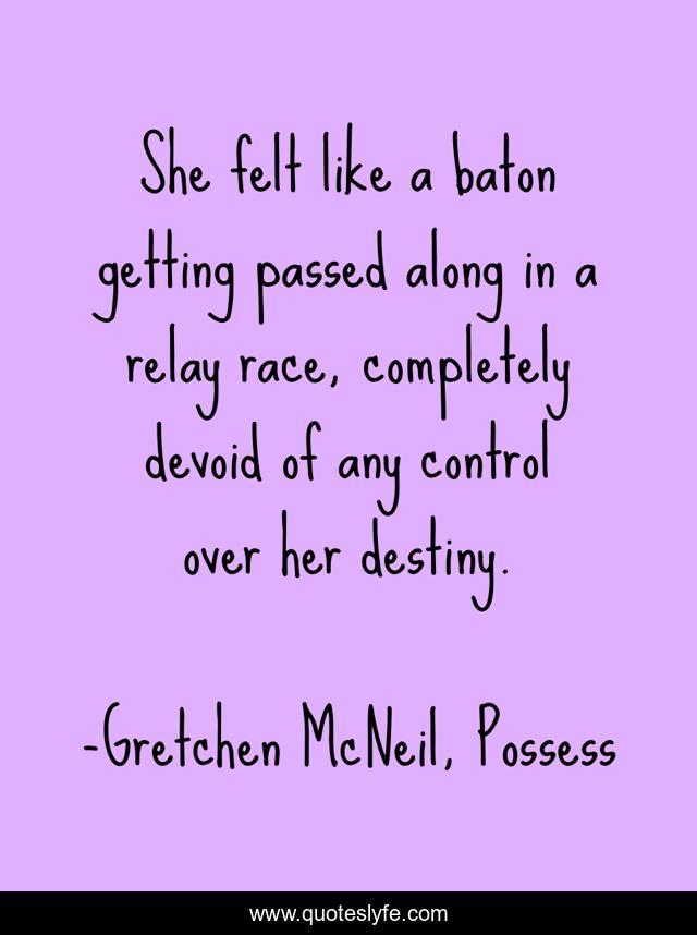 This page presents the quote "She felt like a baton getting passed along in a relay race, completely devoid of any control over her destiny.". Author of this quote is Gretchen McNeil, Possess. This quote is about control, life, destiny,.