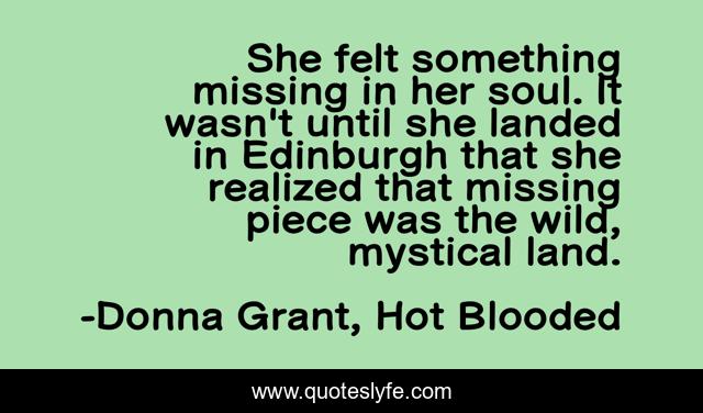 This page presents the quote "She felt something missing in her soul. It wasn't until she landed in Edinburgh that she realized that missing piece was the wild, mystical land.". Author of this quote is Donna Grant, Hot Blooded. This quote is about scotland, dragons,.