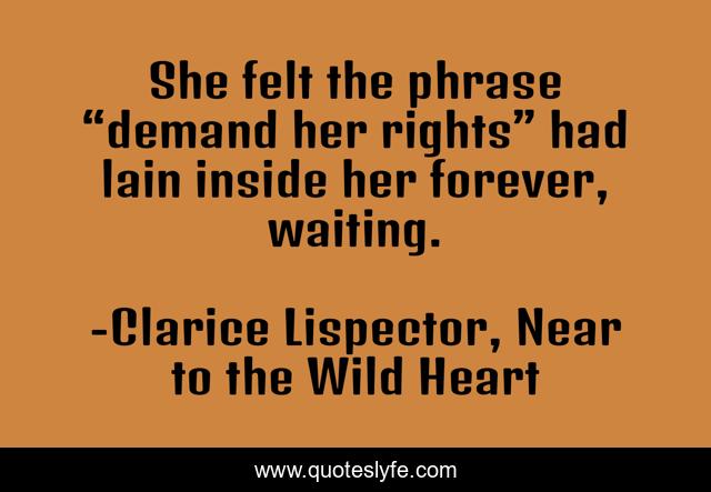 This page presents the quote "She felt the phrase “demand her rights” had lain inside her forever, waiting.". Author of this quote is Clarice Lispector, Near to the Wild Heart. This quote is about women-writers, feminism, women-rights,.