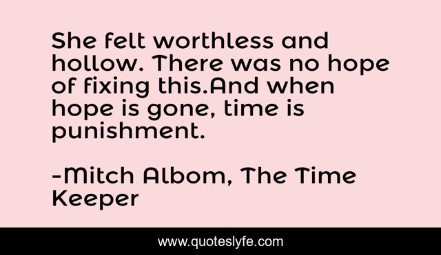 This page presents the quote "She felt worthless and hollow. There was no hope of fixing this.And when hope is gone, time is punishment.". Author of this quote is Mitch Albom, The Time Keeper. This quote is about suicide, hopeless,.