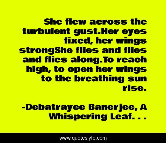 This page presents the quote "She flew across the turbulent gust.Her eyes fixed, her wings strongShe flies and flies and flies along.To reach high, to open her wings to the breathing sun rise.". Author of this quote is Debatrayee Banerjee, A Whispering Leaf. . .. This quote is about eyes, flying, sun-rise, inspirational, enthusiasm, wings, dreams,.