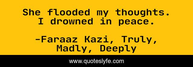 This page presents the quote "She flooded my thoughts. I drowned in peace.". Author of this quote is Faraaz Kazi, Truly, Madly, Deeply. This quote is about true-love, poem, love, poetry, romance, affection,.
