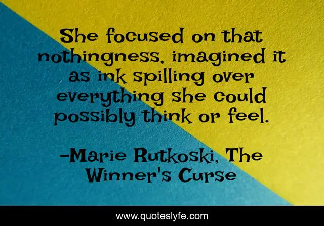 This page presents the quote "She focused on that nothingness, imagined it as ink spilling over everything she could possibly think or feel.". Author of this quote is Marie Rutkoski, The Winner's Curse. This quote is about nothing, kestrel, the-winner-s-curse, black,.