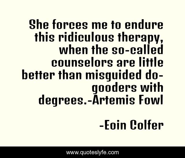 This page presents the quote "She forces me to endure this ridiculous therapy, when the so-called counselors are little better than misguided do-gooders with degrees.-Artemis Fowl". Author of this quote is Eoin Colfer. .