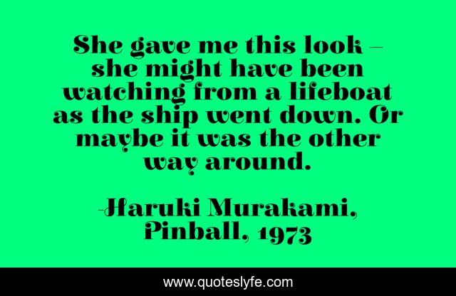 This page presents the quote "She gave me this look – she might have been watching from a lifeboat as the ship went down. Or maybe it was the other way around.". Author of this quote is Haruki Murakami, Pinball, 1973. .