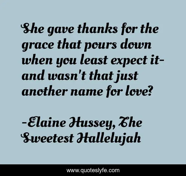 This page presents the quote "She gave thanks for the grace that pours down when you least expect it-and wasn't that just another name for love?". Author of this quote is Elaine Hussey, The Sweetest Hallelujah. This quote is about friends, family, love, grace, affection,.