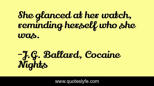 "J.G. Ballard, Cocaine Nights Quotes." Quoteslyfe.com, 2025. Mon. 08 Dec. 2025. <https://www.quoteslyfe.com/quote/She-glanced-at-her-watch-reminding-herself-171441>.