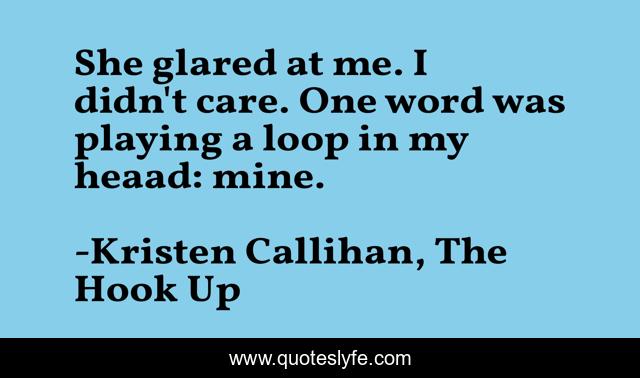 This page presents the quote "She glared at me. I didn't care. One word was playing a loop in my heaad: mine.". Author of this quote is Kristen Callihan, The Hook Up. This quote is about new-adult, the-hook-up, college, humor, contemporary-romance,.