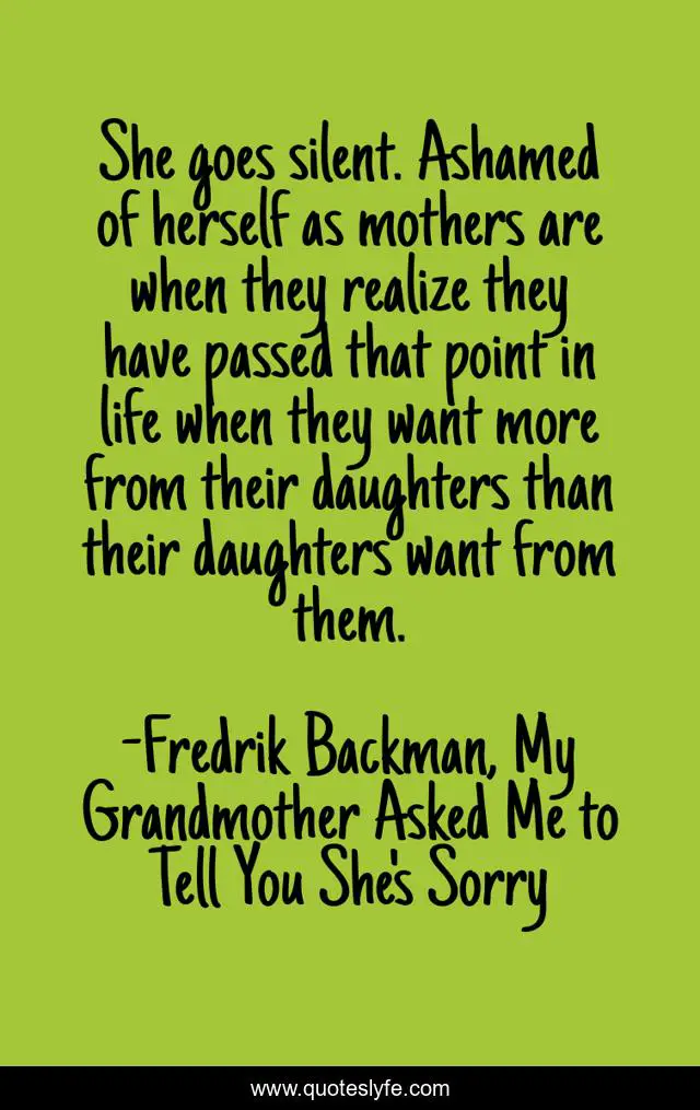 This page presents the quote "She goes silent. Ashamed of herself as mothers are when they realize they have passed that point in life when they want more from their daughters than their daughters want from them.". Author of this quote is Fredrik Backman, My Grandmother Asked Me to Tell You She's Sorry. .