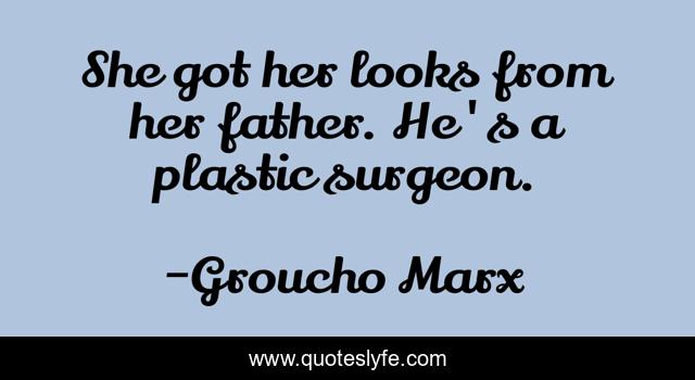 This page presents the quote "She got her looks from her father. He's a plastic surgeon.". Author of this quote is Groucho Marx. This quote is about surgeon, father, she,.