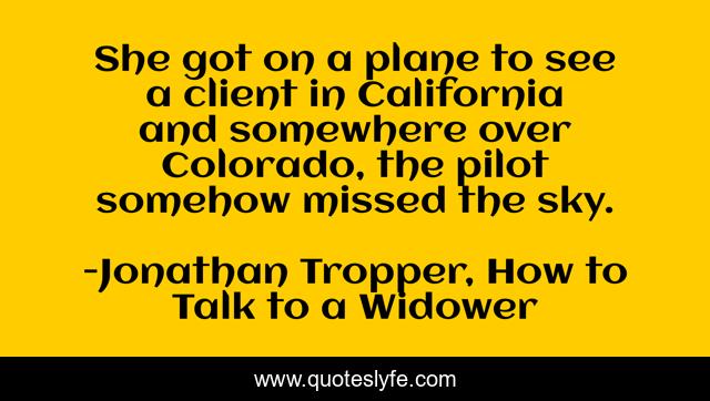 This page presents the quote "She got on a plane to see a client in California and somewhere over Colorado, the pilot somehow missed the sky.". Author of this quote is Jonathan Tropper, How to Talk to a Widower. This quote is about death, crash, travel, sadness, plane, vivid-descriptions,.
