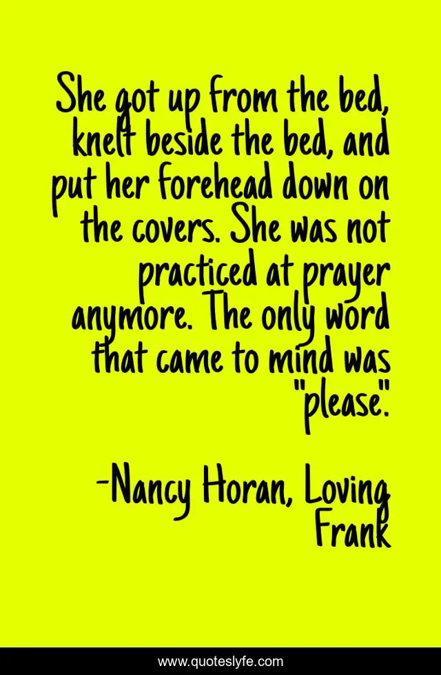 This page presents the quote "She got up from the bed, knelt beside the bed, and put her forehead down on the covers. She was not practiced at prayer anymore. The only word that came to mind was "please".". Author of this quote is Nancy Horan, Loving Frank. .
