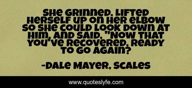 This page presents the quote "She grinned. Lifted herself up on her elbow so she could look down at him, and said, "Now that you've recovered, ready to go again?". Author of this quote is Dale Mayer, Scales. This quote is about romance, broken, mending, scales,.