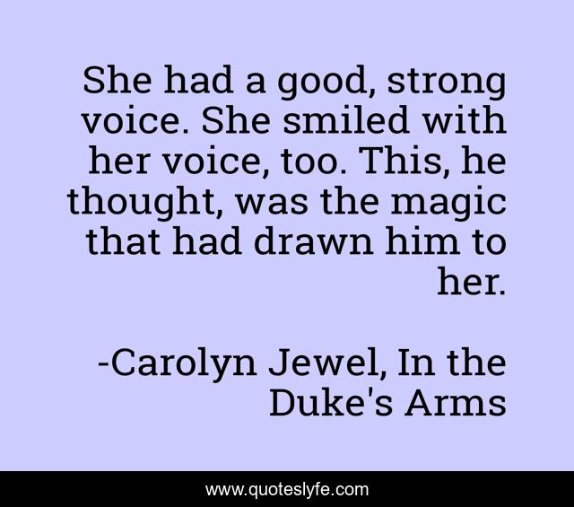 This page presents the quote "She had a good, strong voice. She smiled with her voice, too. This, he thought, was the magic that had drawn him to her.". Author of this quote is Carolyn Jewel, In the Duke's Arms. This quote is about romance, voice, historical-romance,.