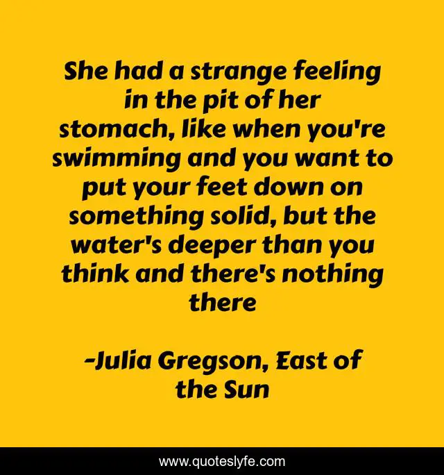 This page presents the quote "She had a strange feeling in the pit of her stomach, like when you're swimming and you want to put your feet down on something solid, but the water's deeper than you think and there's nothing there". Author of this quote is Julia Gregson, East of the Sun. This quote is about drowning, east-of-the-sun, scared, feet, strange, julia-gregson, feeling, panic, swimming,.